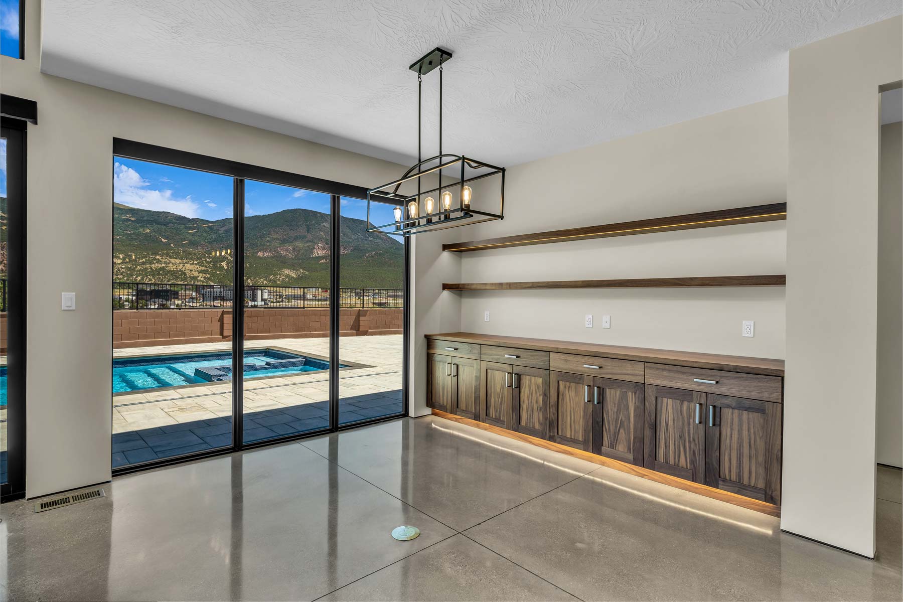 At 5,391 sq. ft., this Cedar City retreat offers a luxurious balance of space, comfort, and modern design. With 5 bedrooms and 5 bathrooms, the home is tailored for elevated living. The spa-inspired primary bathroom features intricate tilework, a soaking tub, and a floor-to-ceiling tiled shower that exudes sophistication. The walkout basement opens to a private swimming pool, complete with fold-away doors that create a seamless indoor-outdoor flow. A sauna adds an extra layer of relaxation, while the surrounding mountain views set the perfect backdrop. With an RV garage alongside the 2-car garage, this home combines thoughtful design with resort-style amenities—making it an entertainer’s dream and a sanctuary all in one.